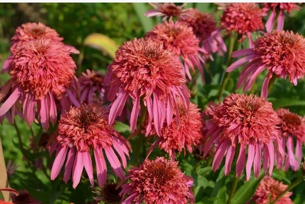 Со второго сезона на мощных цветоносах раскрываются махровые, до 12 см в поперечнике соцветия. Лепестки лучами расходятся вокруг выпуклого, щетинистого «шишковидного» центра и окрашены в утонченный лососево-розовый тон. Под землей – разветвленное стержневое корневище с множеством ответвлений, уходящих примерно на 25 см.