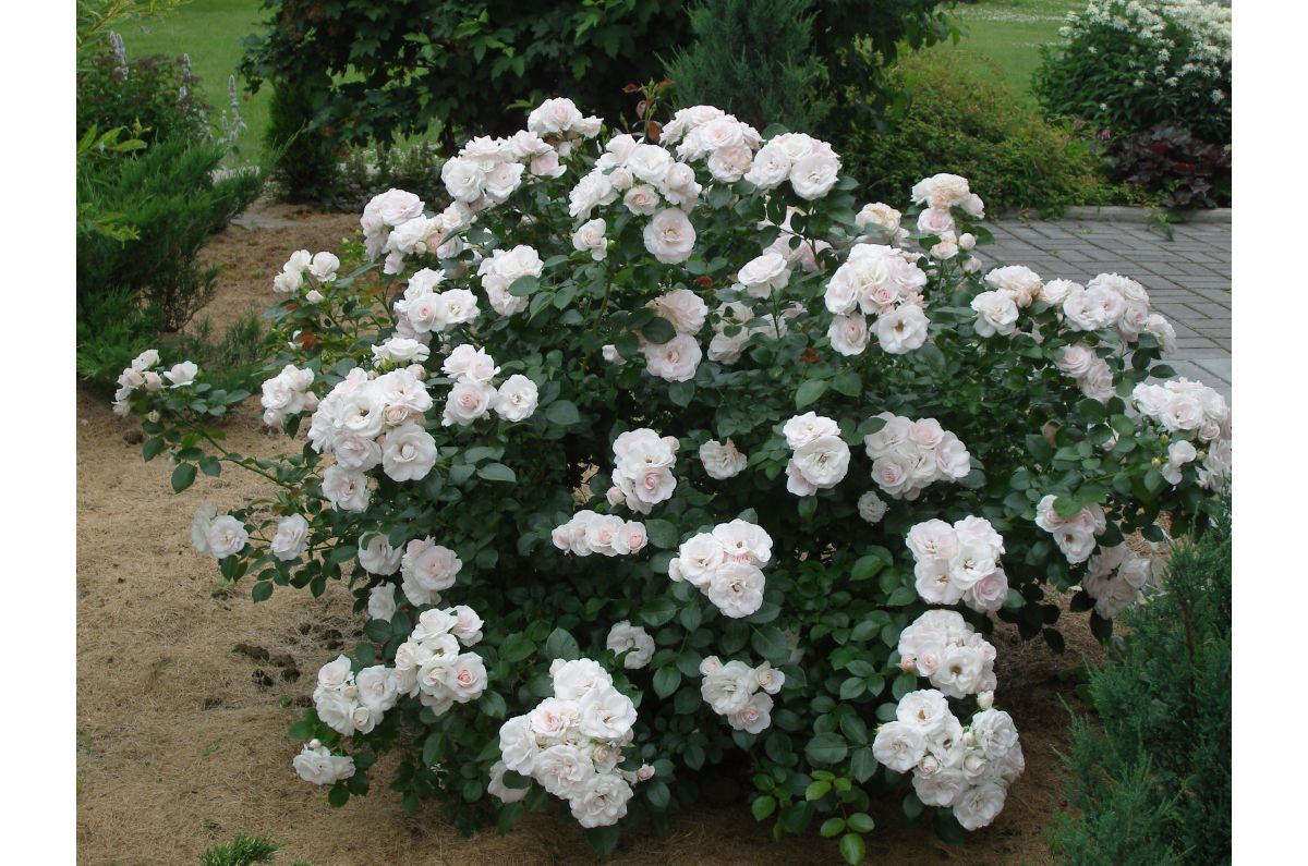 Парковая роза Аспирин Розе (Aspirin Rose) – это изысканный сорт, который станет настоящим украшением вашего сада. Этот сорт розы отличается обильным и продолжительным цветением, начиная с конца весны и до первых заморозков. Цветки имеют нежный белый оттенок с легким розовым румянцем, который особенно проявляется в прохладную погоду.